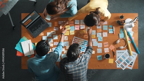 Time lapse of business team with casual outfit looking laptop screen and sharing idea. Aerial view of manager working and checking color palette at table with sticky notes and headphone. Symposium.