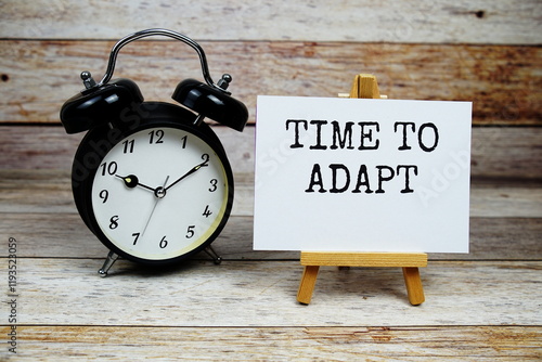 Time to Adapt text written on paper card with alarm clcok on wooden background