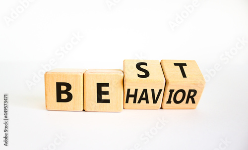 Time to best behavior symbol. Turned wooden cubes with words 'best behavior'. Beautiful white table, white background, copy space. Psychology, healthy lifestyle and best behavior concept.