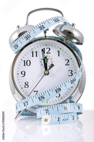 alarmclock, tape measure, diet, healthy lifestyle, dieting, clock, time, clock dial, old-fashioned, midday, antique, bell, silver, chrome, metal, measure, measurement, gauge, work tool, tape, wrapped, blue, closeup, number, nobody, empty, colours, horizontal, isolated on white, isolated