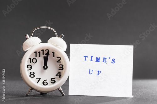 Times up blue text on adhesive note near the white alarm clock against black backdrop