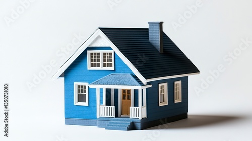 Tiny blue house model with simple architectural details white accents clean and sleek real estate visualization isolated on white background