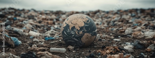 Tiny Planet Earth Surrounded by Garbage in a Dump, Symbolizing Environmental Pollution, Waste Crisis, Climate Change, Sustainability, Ecological Awareness