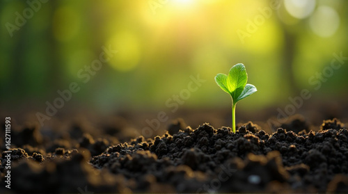 Tiny sprout reaching for sunlight symbolizes hope and new beginnings in lush green garden