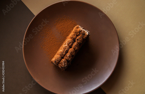 Tiramisu cake on brown background. Minimal modern dessert concept. Top view