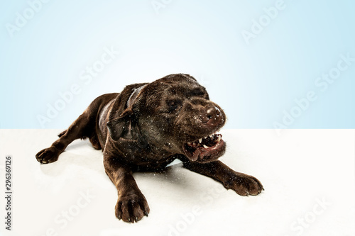 Tired after a good walk. Chocolate labrador retriever dog sits and yawn in the studio. Indoor shot of young pet. Funny puppy over white background.