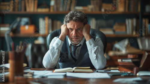 tired man sitting at the library table Surrounded by books and computers Read a book or work