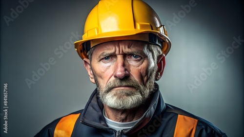 Tired, mature man, approx 60 years old worker in uniform . isolated on Plain background, hard hat and safety gear