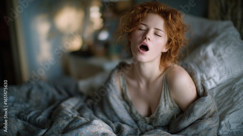 Tired red-haired girl yawning in bed, grey blanket pooling around her, muted tones of morning with delicate light spilling onto soft pillows,