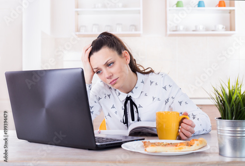 woman, laptop, working, sleepy, food, kitchen, table, indoor, home, office, desk, tea, hot drink, cup, pizza, fast food, unhappy, problem, overtime, house, interior, business, computer, technology, online, cyberspace, network, worried, waiting, drinking, eating, people, female, girl, work, breakfast, lunch, dinner, late, young, snack, caucasian, sitting, lifestyle, notebook, modern, person