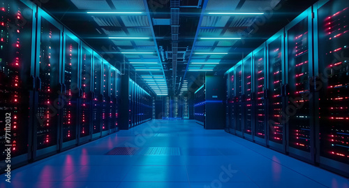 Title: "Digital Fortress" Art Description: This artwork depicts a cutting-edge data center, featuring rows of server cabinets bathed in blue and red lights, symbolizing the power and sophistication of