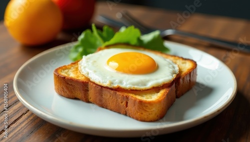 Toast with golden brown fried egg on top, served on a modern wooden table, utensils, breakfast