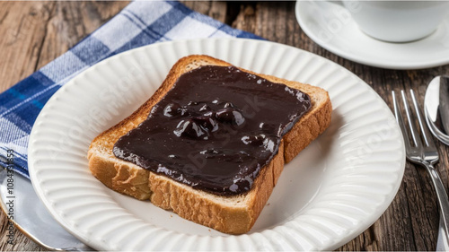 Toast with Spread & Coffee: A slice of toast with dark chocolate or berry spread on a white plate, accompanied by a cup of black coffee, silver utensils, and a checkered napkin.