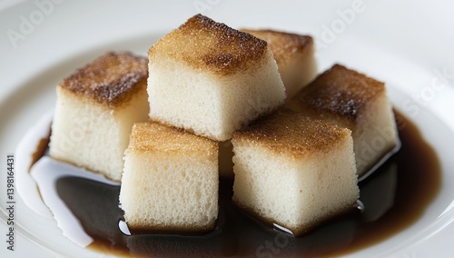 bread, cube, toasted, sauce, dark, plate, white, food, dessert, closeup, cookery, cooking, bakery, pastry, sweet, brown, delicious, deliciously, snack, breakfast, brunch, meal, dish, receipe, eatery, cafes, epicure, gastronomy, culinary, treat, taste, texture, crispy, caramel, sugary, gold, image, photo, studio, background, epicure, eating