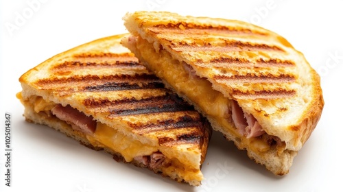 Toasted cheese and ham panini with visible grill marks, cut in half, and displayed on a white background for a savory food shot