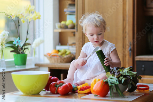assistant, baby, bowl, tied-up, care, chef, children, childhood, cooking, cucumber, delicious, diet, dinner, food, girl, glasses, green, health, healthy, home, indoor, infant, interior, children, kitchen, knife, leaf, little, lunch, meal, nourishment, onion, orange, paprika, people, person, preparation, red, salad, sitting, small, table, toddler, tomatoes, tool, utensil, vegetable, vegetarian, window