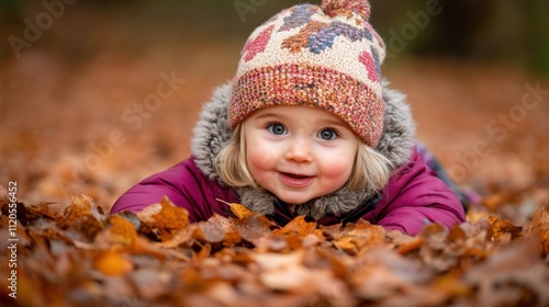 toddler, girl, smiling, autumn, leaf, fall, happy, children, cute, baby, face, eye, blond, hair, hat, winter, jacket, purple, red, brown, orange, yellow, nature, outdoors, park, wood, forest, ground, cheerful, playful, joyful, bright, adorable, innocent, beautiful, expression, season, photo, portrait, little, small