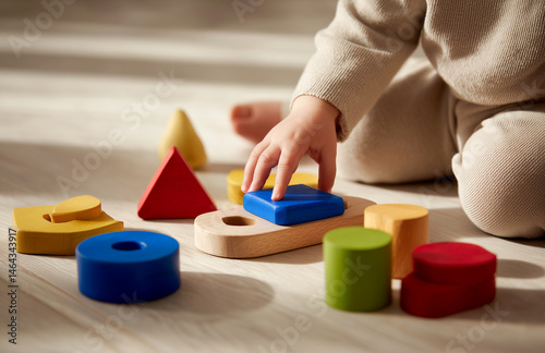 Toddler Playing with Colorful Wooden Educational Toys on Light Wooden Floor