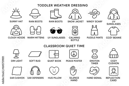 toddler, weather, dressing, classroom, quiet, sunny, rain, boot, snow, windy, foulard, sunglasses, hoodie, mitten, calming, puddle, pant, beanie, dim, light, soft, rug, book, peace, poster, timer, cosy, cushion, ear, hug, pillow, silence, hand, signal, card, vector, icon