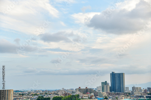 Tokyo Japan cityscape background oh the cloudy day. In the image compose of Japan residential area and building, apartment and condominium with cloudy sky as a background also a copy space area left.