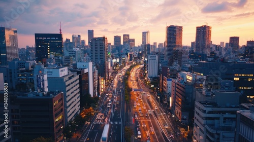 Tokyo Skyline Sunset: Aerial View of City Highway at Dusk