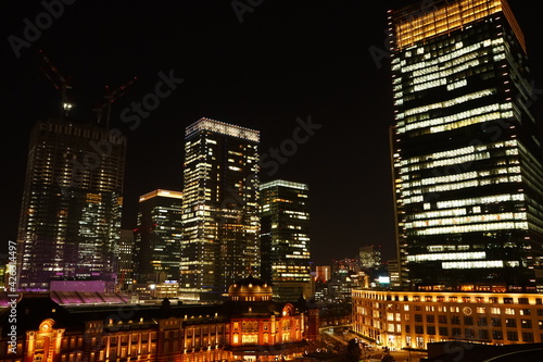 Tokyo Station and skyscraper at night in Tokyo, Japan - 東京駅 夜景 日本