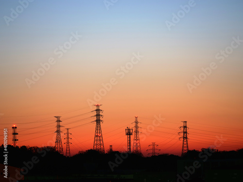 beautiful, colours, gradation, dawn, winter, morning, sunrise, sky, blue, tokyo, daybreak, break, electric, transmission, tower, silhouette, cable, wire, electricity, sunset, power, energy, pylon, industry, line, voltage, industrial, orange, high, evening, steel, technology, electrical, sun, landscape