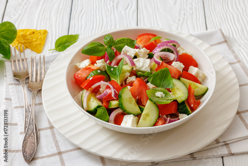 basil, bowl, closeup, colourful, crumbled, cucumber, diet, dinner, food photography, fork, fresh, goat cheese, epicure, healthy, lunch, meal, mediterranean, natural light, no people, organic, ready to eat, red onion, eatery, salad, side dish, snack, studio shot, tomatoes, topview, vegan, vegetarian, vibrant, white, wholesome, wood table