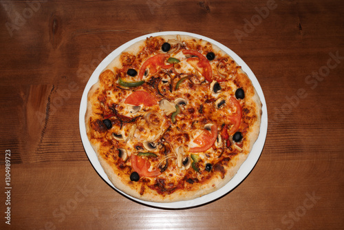 Tomato mushroom pizza retro flash food photography