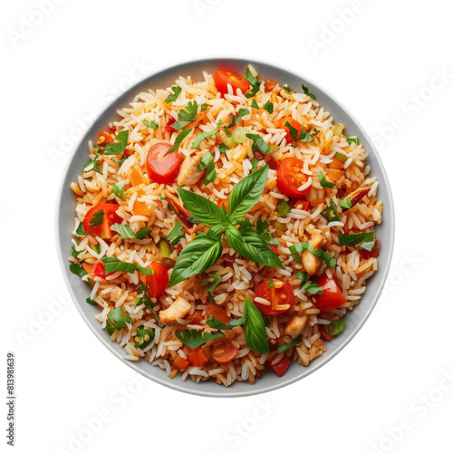 tomato rice with vegetables and chicken healthy isolated on white background.
