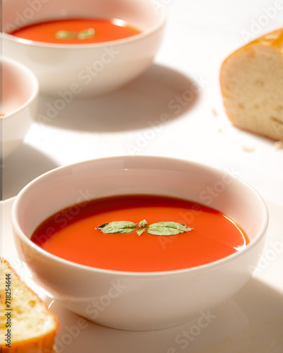 tomato soup, comfort food, bread, marble, basil, bowl, vegetable, dinner, tomatoes, meal, vegetarian, lunch, plate, healthy, epicure, red, food, soup, cream, dish, white, cookery, parsley, spoon, hot, carrot, pumpkin