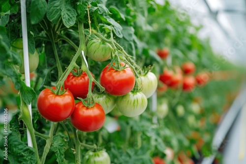 Tomatoes growing on vines in a greenhouse with red and green fruits.