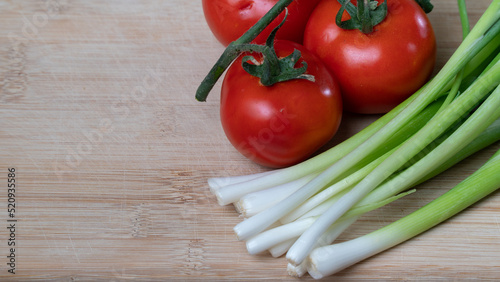 tomatoes on a branch and green onions, vegetables and greens on a wooden background