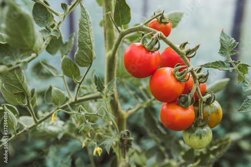 Tomatoes on a twig grow in a greenhouse. A twig of several tomatoes growing in a greenhouse. Red ripe tomatoes on the bush.