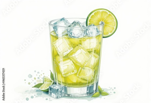 Tommy's Margarita with wheel and ice cubes in a clear lowball glass on white background. Watercolor illustration