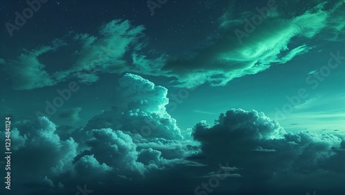 Toned Blue and Green Night Sky with Clouds, Illuminated by Distant Stars and a Mysterious Darkness, Creating a Dreamy and Ethereal Atmosphere Above the Landscape