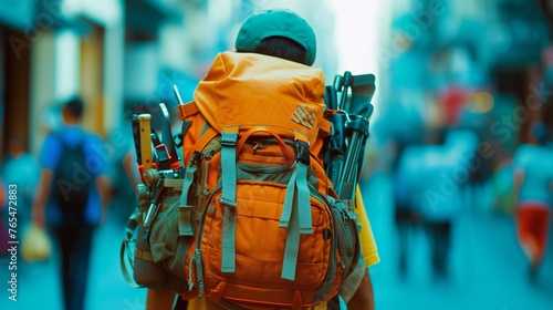 Tool-Laden Backpack: A child, school bag overflowing with construction tools, blends into the blur of city streets.