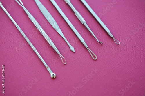 Tools for removing acne. Tools of the cosmetologist for problem skin on pink paper background.