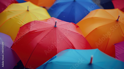Top down view of colorful umbrellas in the rain. Background image. Created with Generative AI technology.