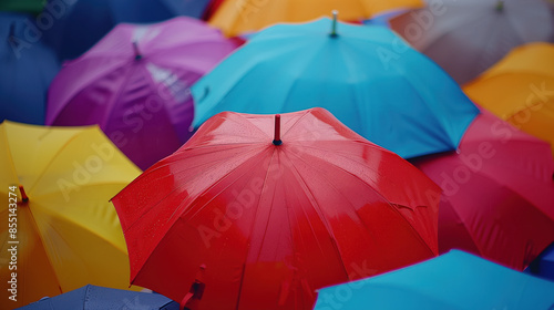 Top down view of colorful umbrellas in the rain. Background image. Created with Generative AI technology.