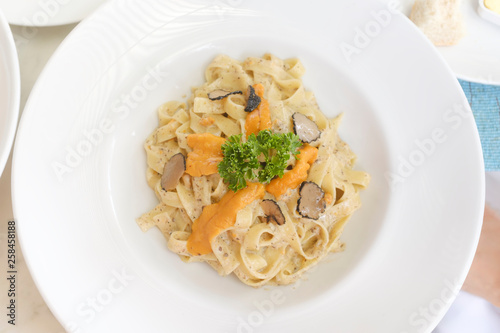 top down view of pasta cream sauce on top with truffles, uni sea urchin, in a white plate