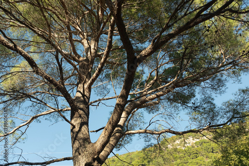 Top of pine tree on a sunny day. Pine landscape for publication, poster, calendar, post, screensaver, wallpaper, postcard, banner, cover. High quality photo
