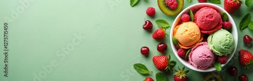ice cream, fruit, green background, topview, bowl, kiwi, strawberry, cherry, raspberry, orange, mint, vibrant, sweet, delicious, creamy, refreshing, dessert, epicure, indulgence, appetising, tasty, eye-catching, playful, food, photo, culinary arts, fresh, natural, organic, bright, cheerful, festive, delightful, treat, snack, creative, inviting, tropical, fruity, summer, refreshment, glacé, sweet, berry, colourful, favor, deliciously, vegan, vegetarian