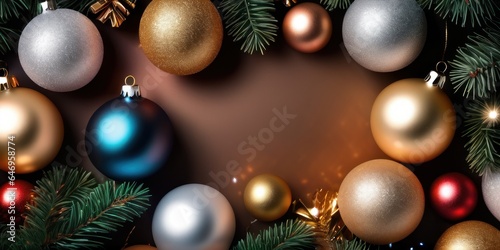 Top view. Christmas and New years eve Background. Beautiful Wide Angle Holiday Template with Christmas balls, fir tree and highlights with copy space. Christmas and New year greeting card concept