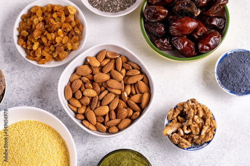 Top view collection of Superfoods in Bowls for health, fitness and vitality in bowls used for preparing energy balls.