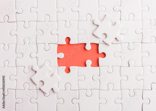 Top view flat lay of paper plain white jigsaw puzzle game texture last pieces for solve and place, studio shot on a red background, quiz calculation concept