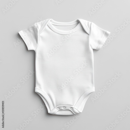 Top view, full shot of white baby bodysuit on gray backdrop. Clean, simple apparel for newborn, infant. Cotton baby clothes, minimalist baby fashion.