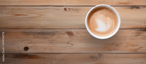 Top view of a Dalgona coffee cup on a wooden table with ample copy space for an image