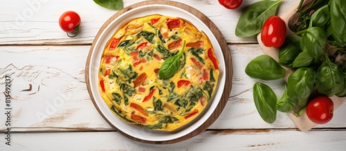 Top view of a delectable Italian Frittata artfully prepared with spinach tomatoes onion and peppers Beautifully presented on a white wooden table the image showcases a perfect dish Abundant copy spac