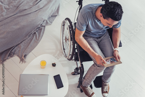 handicapped, childhood, memory, photo, man, smartphone, paralysis, health, wheelchair, disabled, male, alone, home, caucasian, comfort, medicals, domestic, community, social, security, exclusion, problem, immobile, crippled, society, paralyzed, health care, muscle, disability, impairment, barrier, topview, nostalgic, exceptional, always, connected, innovative, digital, technology, device, progressive, contemporary, laptop, children, past